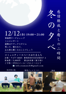 新月の夜、年に4回開催する「冬の夕べ」 今回は都合により新月ではありませんが、12/12(金)に開催します☝️限定8名様のワークショップとミニコンサート♪思い切り笑って、リラックスして、一緒に […]